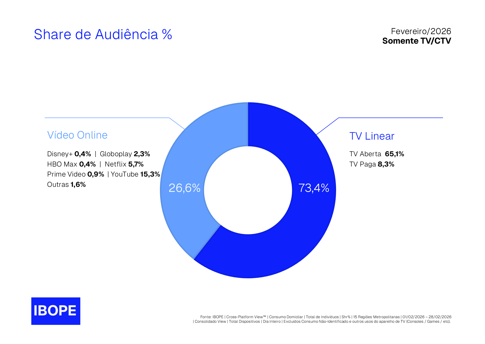 O fato de o YouTube ter participação relevante no consumo de vídeo em aparelhos de TV (15,3% em fevereiro de 2026, segundo o IBOPE) também não o transforma em um canal de televisão. Ainda que o aparelho receptor se chame TV, ele nunca foi determinante para definir o que significa ser um canal de TV. Se assim fosse, uma emissora de rádio automaticamente se transformaria em um canal de TV apenas porque é consumida, ainda que com imagens ao vivo do estúdio, em uma Smart TV.